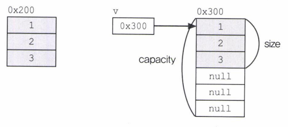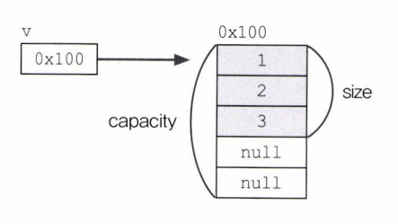 다음 capacity가 5인 Vector인스턴스 v를 생성하고, 3개의 객체를 저장한 후의 상태를 그림으로 나타낸 것이다.