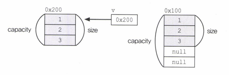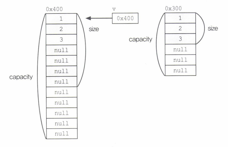 v.ensureCapacity(6)는 v의 capacity가 최소한 6이 되도록 한다. 만일 v의 capacity가 6이상이라면 아무 일도 일어나지 않는다. 현재는 v의 capacity가 3이므로 크기가 6인 배열을 생성해서 v의 내용을 복사했다. 기존의 인스턴스를 다시 사용하는 것이 아니라 새로운 인스턴스를 생성하였음에 주의하자.