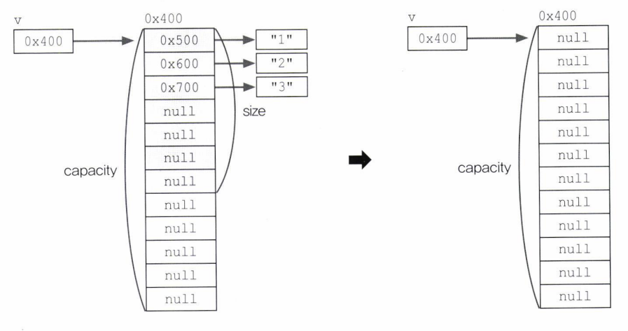 생성자 Vector(int initialCapacity, int capacityIncrement)를 사용해서 인스턴스를 생성한 경우에는 지정해준 capacityIncrement만큼 증가하게 된다.v.clear();는 v의 모든 요소를 삭제한다. 아래의 왼쪽그림의 상태에서 오른쪽 그림과 같은 상태가 되는 것이다.