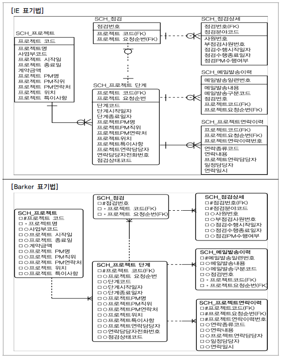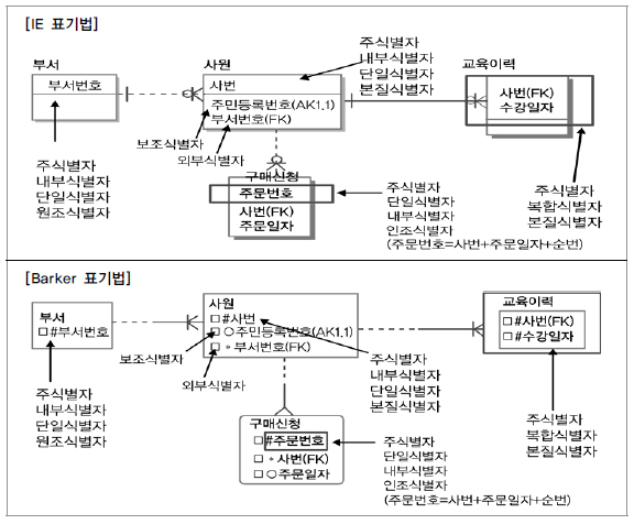 식별자와 비식별자를 적용한 데이터 모델의 예