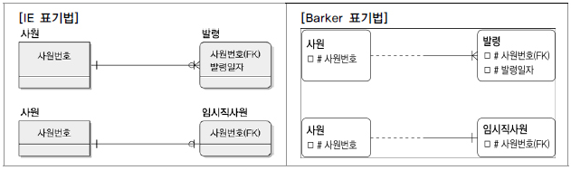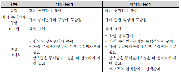 식별자관계와 비식별자관계를 비교하는 내용은 다음과 같다.