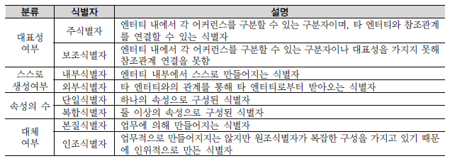 식별자에 대한 위의 분류방법을 데이터 모델에서 표현하면 아래 그림과 같다.
