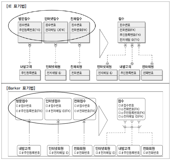 - 여러 개의 엔터티가 하나의 엔터티로 통합 및 표현되었는데 각각의 엔터티가 별도의 관계를 가질 경우외부식별자의 비식별자 역할