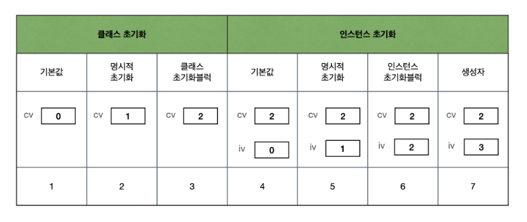 - 기본값 -> 명시적초기화 -> 인스턴스 초기화 블럭 -> 생성자