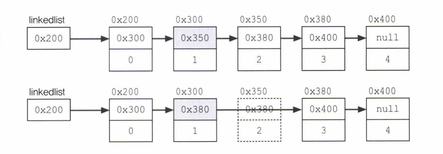 링크드 리스트에서의 데이터 삭제는 간단하다. 삭제하고자하는 요소의 이전요소가 삭제하고자 하는 요소의 다음 요소를 참조하도록 변경하기만 하면 된다. 단 하나의 참조만 변경하면 삭제가 이루어지는 것이다. 배열처럼 데이터를 이동하기 위해 복사하는 과정이 없기 때문에 처리속도가 매우 빠르다.