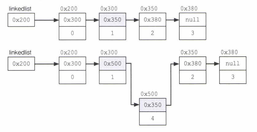 새로운 데이터를 추가할 때는 새로운 요소를 생성한 다음 추가하고자 하는 위치의 이전 요소의 참조를 새로운 요소에 대한 참조로 변경해주고, 새로운 요소가 그 다음 요소를 참조하도록 변경하기만 하면 되므로 처리속도가 매우 빠르다.