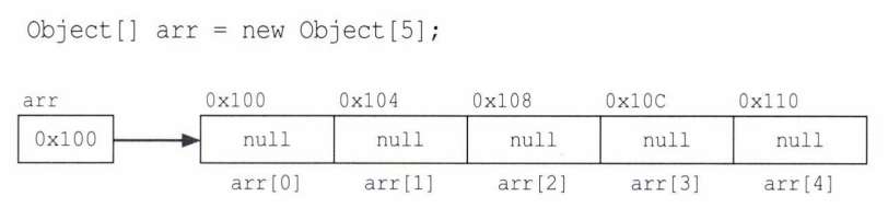 아래와 같이 Object배열이 선언되었을 때 arr[2]에 저장된 값을 읽으려 한다면 n은 2, 모든 참조형 변수의 크기는 4byte이고 생성된 배열의 주소는 0x100이므로 3번째 데이터가 저장되어 있는 주소는 0x100 + 2 * 4 = 0x108이 된다.