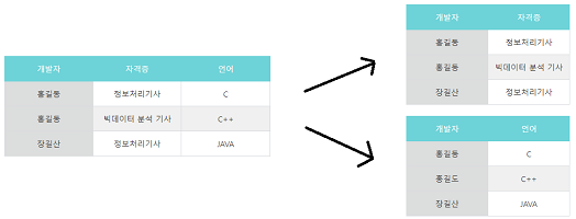- 질의에 대한 응답시간이 느려질 수도 있다. 데이터의 중복 속성을 제거하고 결정자에 의해 동일한 의미의 일반 속성이 하나의 테이블로 집약되므로 한 테이블의 데이터 용량이 최소화되는 효과가 있다.