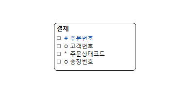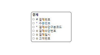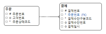 위 이미지는 주문과 결제에 대한 모델이다. 위 모델에서 생소한 속성만 설명하면, 주문 엔터티에서 주문상태 코드는 주문 상태에 대한 코드값으로 ‘주문·취소·반품·교환’ 등의 정보를 관리하고, 결제일시 속성은 실제 결제를 진행한 일시정보를 관리한다. 결제 엔터티에서 결제수단구분코드 속성은 ‘카드결제·계좌이체·핸드폰결제’ 등을 관리하는 코드값이다. 결제수단번호 속성은 결제수단구분코드에서 사용한 실제 ‘카드번호·계좌번호·핸드폰번호’ 등을 관리하는 속성값이다.