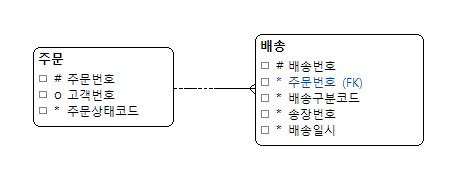 위 이미지는 주문엔터티에 송장번호를 반정규화한 것이다. 지금부터 업무프로세스를 다시 생각해보자. 고객이 주문하면 판매자가 배송을 진행한다고 앞서 설명하였다. 그리고 고객이 주문을 하였다해도 판매자가 그 즉시 배송을 하지않는다. 경우에 따라 판매자의 상품판매 취소가 진행될 수 도 있다. 그렇다면 위와같이 모델을 구성하면 주문이 발생하여 주문번호가 생성되면, 송장번호는 처음에 NULL값이 들어갈 것이고, 배송준비가 완료되어야 갱신을 통해 송장번호가 들어갈 것이다.
