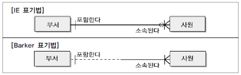 관계차수를 표시하는 방법은 여러 가지가 있지만, Crow’s Foot 모델에서는 선을 이용하여 표현한다. 한 개가 참여하는 경우는 실선을 그대로 유지하고, 다수가 참여한 경우는 까마귀발과 같은 모양으로 그려준다.