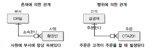 관계는 엔터티와 엔터티 간 연관성을 표현하기 떄문에 엔터티의 정의에 따라 영향을 받기도 하고, 속성 정의 및 관계 정의에 따라서도 다양하게 변할 수 있다.
