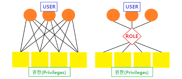 아래 그림은 유저들과 권한들 사이 간 ROLE의 역할을 보여 주고 있다. 왼쪽 그림은 권한을 직접 유저에게 할당할 때를 나타내는 것이며, 오른쪽 그림은 ROLE에 권한을 부여한 후 ROLE을 유저들에게 부여하는 것을 나타내고 있다.