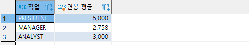 - GROUP BY절의 기준 항목이나 소그룹의 집계함수를 이용한 조건을 표시할 수 있다.