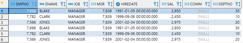 중요 집합 연산자를 사용하기 위해서는 SELECT절의 컬럼수가 동일하고 SELECT절의 동일 위치에 존재하는 컬럼의 데이터 타입이 동일해야 한다.