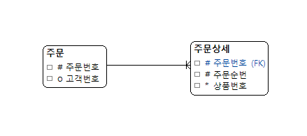 고객이 상품을 구매하면서 발생하는 것이 주문이다. 또한 하나의 주문은 여러 개의 상품을 구매할 수 있다. 그렇다면 여기서 우리는 주문과 주문상세의 데이터는 함께 발생되는가, 아니면 독립적으로 발생되는가를 생각해보아야 한다. 일반적인 업무기준으로 보았을 때 주문이 발생하면 주문상세 데이터도 함께 발생된다. 때문에 위 모델처럼 두 엔터티는 필수적 관계여야하며, 이러한 모델이 트랜잭션이 발생하는 모델이라고 할 수 있다. 즉, 트랜잭션이 발생하려면 모델간의 관계는 필수적이여야하며, 바커 표기법에서의 관계선은 위와 같이 실선으로 표기해 트랜잭션을 표현한다.