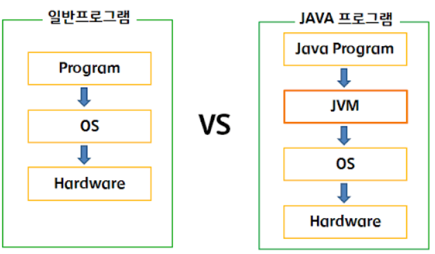 위 이미지를 보면 일반 프로그램은 OS와 바로 맞붙어 있기 때문에 OS종속적이다. 때문에 다른 OS에서 실행시키기 위해서는 애플리케이션을 그 OS에 맞게 변경해주어야한다. 반면 자바 프로그램은 JVM하고만 상호작용을 하기 때문에 OS와 하드웨어에 독립적이라 다른 OS에서도 프로그램 변경없이 실행이 가능한 것이다. 단, JVM은 OS에 종속적이여서 해당 OS에서 실행가능한 JVM이 필요하다.