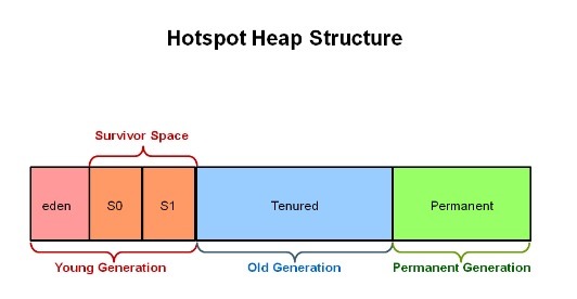 객체를 저장하는 가상메모리 공간. new 연산자로 생성되는 객체와 배열을 저장하며 Class Area(Static Area)에 올라온 클래스들만 객체로 생성할 수 있다. 힙 영역은 다음과 같이 세 부분으로 나뉘어 진다.