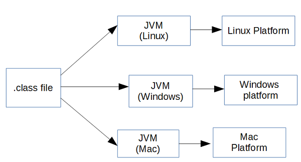 자바 컴파일러는 자바 소스 프로그램을 컴파일하여 바이트 코드로 된 클래스 파일을 생성한다. 이 클래스 파일은 컴퓨터의 CPU에 의해 직접 실행되지 않고, JVM이 인터프리터 방식으로 실행시킨다. 이 클래스 파일은 어떤 OS를 탑재하든 CPU의 종류가 무엇이든, 어떤 하드웨어든 상관없이 JVM만 있으면 바로 실행 가능하며, 실행시 JVM의 JIT컴파일러에 의해 바이너리 코드로 변환되어 프로그램을 실행시킨다.