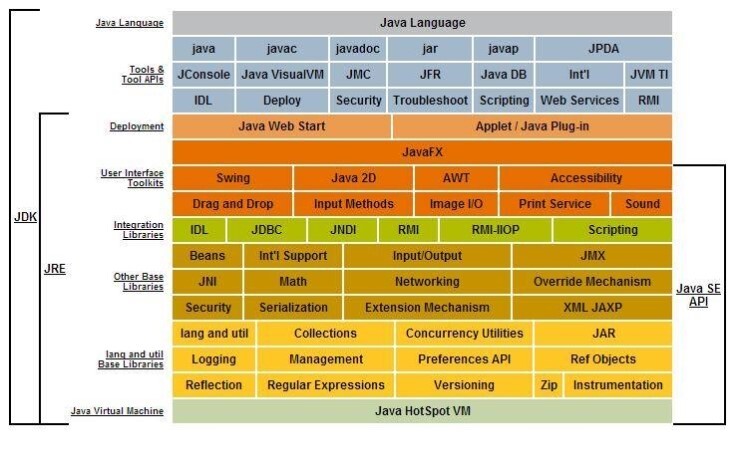 JDK에는 JAVA 프로그램을 작성하는데 필요한 도구와 이를 실행하는데 필요한 JRE가 포함되어 있으며, 컴파일러(javac), JAVA 애플리케이션 시작 프로그램, 애플릿 뷰어 등도 포함되어 있다.